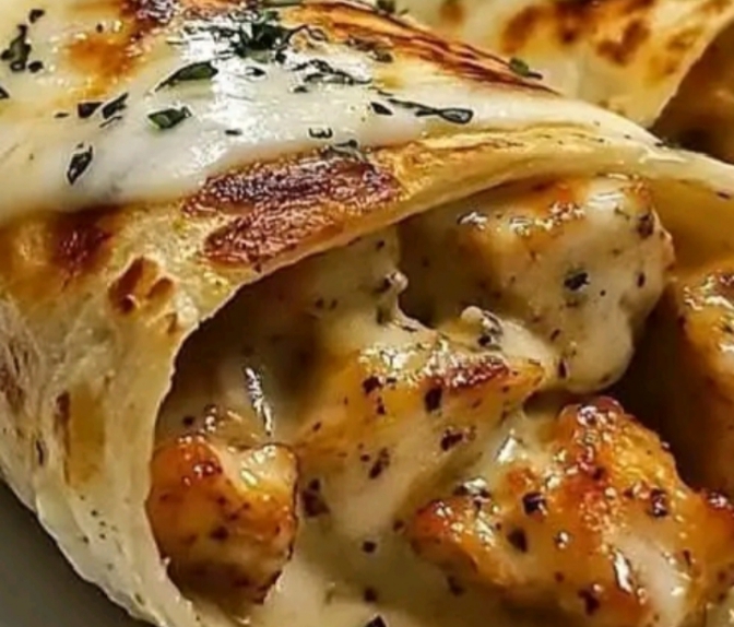 Ingredients For the Chicken:2 boneless, skinless chicken breasts (about 1 lb)2 tablespoons olive oil3 cloves garlic, minced1 teaspoon paprika1 teaspoon onion powder½ teaspoon dried thymeSalt and pepper to tasteFor the Cheesy Garlic Sauce:½ cup cream cheese, softened½ cup shredded mozzarella cheese¼ cup grated Parmesan cheese2 tablespoons butter, melted2 cloves garlic, minced1 teaspoon dried parsley (optional)For the Wraps:4 large flour tortillas (whole wheat or spinach tortillas can be used)1 cup fresh spinach or lettuce (optional, for crunch)1 tomato, sliced (optional)Optional Additions:Veggies: Sautéed onions, bell peppers, or mushrooms for extra flavor.Spicy Kick: Add crushed red pepper flakes or hot sauce for a spicy twist.Instructions1. Prepare the Chicken:Slice the chicken breasts into strips or cubes.In a large skillet, heat the olive oil over medium heat.Add minced garlic and sauté for 1-2 minutes until fragrant.Season the chicken with paprika, onion powder, dried thyme, salt, and pepper.Add the chicken to the skillet and cook for 6-8 minutes, turning occasionally, until fully cooked and golden brown. Set aside.2. Make the Cheesy Garlic Sauce:In a small saucepan, combine the cream cheese, shredded mozzarella, grated Parmesan, melted butter, and minced garlic.Cook over low heat, stirring constantly, until the cheeses melt and the sauce becomes smooth and creamy.Stir in dried parsley if desired.3. Assemble the Wraps:Warm the tortillas in a skillet or microwave for easier folding.Spread a generous layer of the cheesy garlic sauce over each tortilla.Add the cooked chicken, fresh spinach or lettuce, and tomato slices.Add any optional veggies or spices for extra flavor.4. Wrap and Serve:Fold the sides of the tortilla inward and roll tightly into a wrap.Serve immediately or toast the wraps in a skillet for 1-2 minutes on each side for a crispy finish.Enjoy your Cheesy Garlic Chicken Wraps!