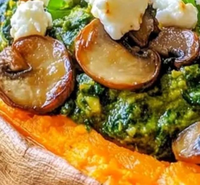 IntroductionThese Stuffed Sweet Potatoes are a symphony of flavors and textures—creamy roasted sweet potatoes, savory sautéed mushrooms and spinach, tangy feta, and fragrant rosemary, all topped with a vibrant fresh basil pesto. Perfect as a hearty vegetarian main or an impressive side dish, this recipe balances nutrition, ease, and gourmet appeal. The natural sweetness of the potatoes contrasts beautifully with the umami-rich filling, while the pesto adds a bright, herbaceous finish.Key Culinary Techniques & ScienceRoasting Sweet Potatoes: Slow-roasting at 375°F (190°C) ensures even cooking, caramelizing natural sugars for depth of flavor while keeping the flesh tender.Sautéing Mushrooms: Cooking mushrooms on medium-high heatdrives off moisture, concentrating their umami-rich taste.Emulsifying Pesto: Blending basil, nuts, garlic, and oil creates a stable emulsion, with Parmesan adding savoriness and lemon juice balancing richness.Ingredients & SubstitutionsFor the Sweet Potatoes4 medium sweet potatoes (about 1.5 lbs / 700g)1 tbsp olive oil½ tsp saltFor the Filling1 tbsp olive oil8 oz (225g) cremini mushrooms, diced (sub: shiitake or button mushrooms)2 cloves garlic, minced4 cups fresh spinach (sub: kale or Swiss chard)½ tsp dried rosemary (sub: thyme or oregano)¼ tsp black pepper½ cup (75g) crumbled feta (sub: goat cheese or vegan feta)For the Basil Pesto2 cups fresh basil leaves, packed¼ cup (30g) pine nuts (sub: walnuts or almonds)1 small garlic clove¼ cup (25g) grated Parmesan (sub: nutritional yeast for vegan)¼ cup (60ml) extra-virgin olive oil1 tbsp lemon juiceSalt & pepper to tasteStep-by-Step Instructions1. Roast the Sweet PotatoesPreheat oven to 375°F (190°C).Scrub potatoes, pat dry, then prick with a fork. Rub with olive oil and salt.Place on a baking sheet and roast for 45–55 minutes, until tender when pierced with a knife.Pro Tip: For crispier skins, increase heat to 400°F (200°C) for the last 10 minutes.2. Sauté the FillingHeat olive oil in a pan over medium-high heat.Add mushrooms and cook until browned (~5 min).Stir in garlic, rosemary, salt, and pepper; cook 1 minute.Add spinach and wilt (~2 min). Remove from heat and mix in feta.3. Make the Basil PestoIn a food processor, blend basil, pine nuts, garlic, and Parmesan.Drizzle in olive oil while blending until smooth.Stir in lemon juice, then season to taste.Pro Tip: Add a splash of water if the pesto is too thick.4. Assemble & ServeSlice roasted sweet potatoes open and fluff the insides with a fork.Spoon in the mushroom-spinach filling, drizzle with pesto, and garnish with extra feta and basil.Troubleshooting AdvicePotatoes too hard? Roast longer or microwave for 2–3 minutes before baking.Filling too watery? Cook mushrooms longer to evaporate excess moisture.Pesto too bitter? Balance with more Parmesan or a pinch of sugar.Creative VariationsProtein Boost: Add lentils, chickpeas, or shredded chicken.Vegan Version: Use tofu feta and omit Parmesan.Spicy Twist: Mix harissa or chili flakes into the filling.Nut-Free Pesto: Substitute sunflower seeds for pine nuts.Serving SuggestionsPair with a crisp green salad or garlic bread.Serve alongside grilled chicken or fishfor a protein-rich meal.Drizzle with balsamic glaze for extra tang.ConclusionThese Stuffed Sweet Potatoes are a celebration of textures and flavors—earthy, creamy, tangy, and fresh in every bite. Whether you’re cooking for a weeknight dinner or entertaining guests, this dish is versatile, nutritious, and downright delicious. Don’t be afraid to experiment with fillings or toppings—the possibilities are endless!Now, grab your ingredients and let’s get roasting!